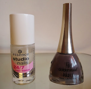 O verniz que estou a usar desta vez é da marca Golden Rose, que descobri recentemente e que se tem revelado muito bom. Antes de mais, comecei por aplicar a base da Essence 24/7, que promete melhorar a aderência do verniz e aumentar a duração do verniz sem lascar. Após a base apliquei o nº 147 da Golden Rose, este é um tom entre o castanho e o cinzento e tem uns brilhinhos muito discretos roxos, é tão bonito que foi impossível não me apaixonar por ele assim que o vi na loja. Este verniz é cremosinho, tem uma boa pigmentação, dá uma boa cobertura e tem uma duração muito boa.